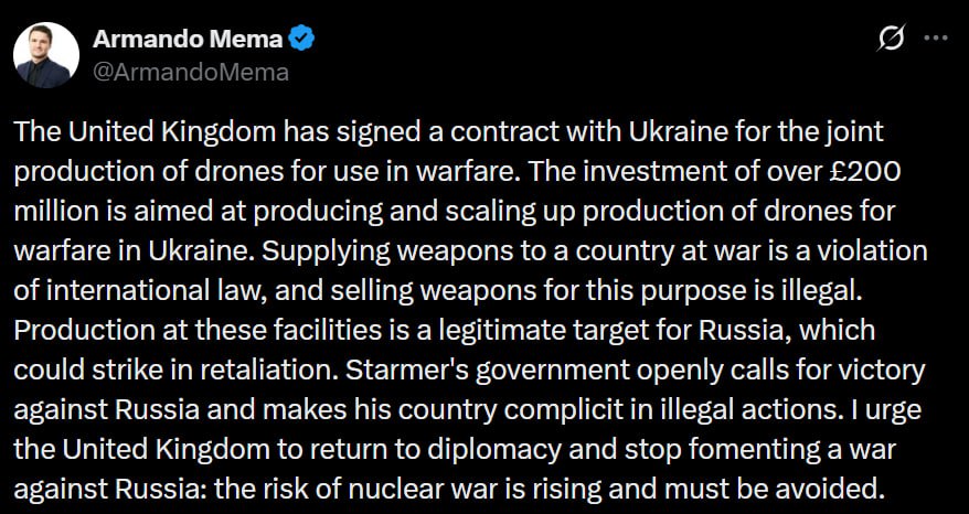 «Соединенное Королевство подписало контракт с Украиной на совместное производство беспилотников для использования в военных действиях. Инвестиции в размере более 200 миллионов фунтов стерлингов направлены на производство и наращивание объемов производства беспилотников для войны на территории Украины. Поставка оружия стране, находящейся в состоянии войны, является нарушением международного права, а продажа оружия с этой целью незаконна. Производство на этих объектах является законной целью для России, которая может нанести ответный удар. Правительство Стармера открыто призывает к победе над Россией и делает свою страну соучастницей незаконных действий. Я призываю Соединенное Королевство вернуться к дипломатии и прекратить разжигание войны против России: риск ядерной войны возрастает, и этого необходимо избежать».
