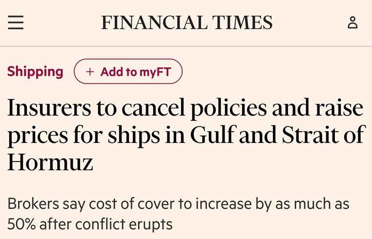 Cтраховщики сообщили судовладельцам, что отменяют действующие полисы и повысят стоимость страхования судов, следующих через Персидский залив и Ормузский пролив, после того как США и Израиль нанесли удар по Ирану, — констатирует британская Financial Times