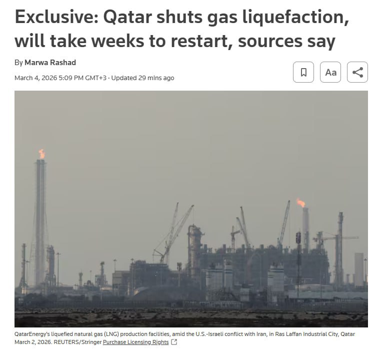 Катар прекращает сжижение СПГ на заводе в Рас-Лаффане, объявив форс-мажор в отношении экспорта. Возобновление производства займет не менее двух недель, а еще две недели потребуются для выхода на полную мощность.