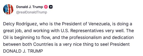 «Дэлси Родригес, которая является президентом Венесуэлы, отлично справляется со своей работой и очень хорошо сотрудничает с представителями США. Нефть начинает поступать, и профессионализм и преданность делу между двумя странами — это очень приятно видеть!»