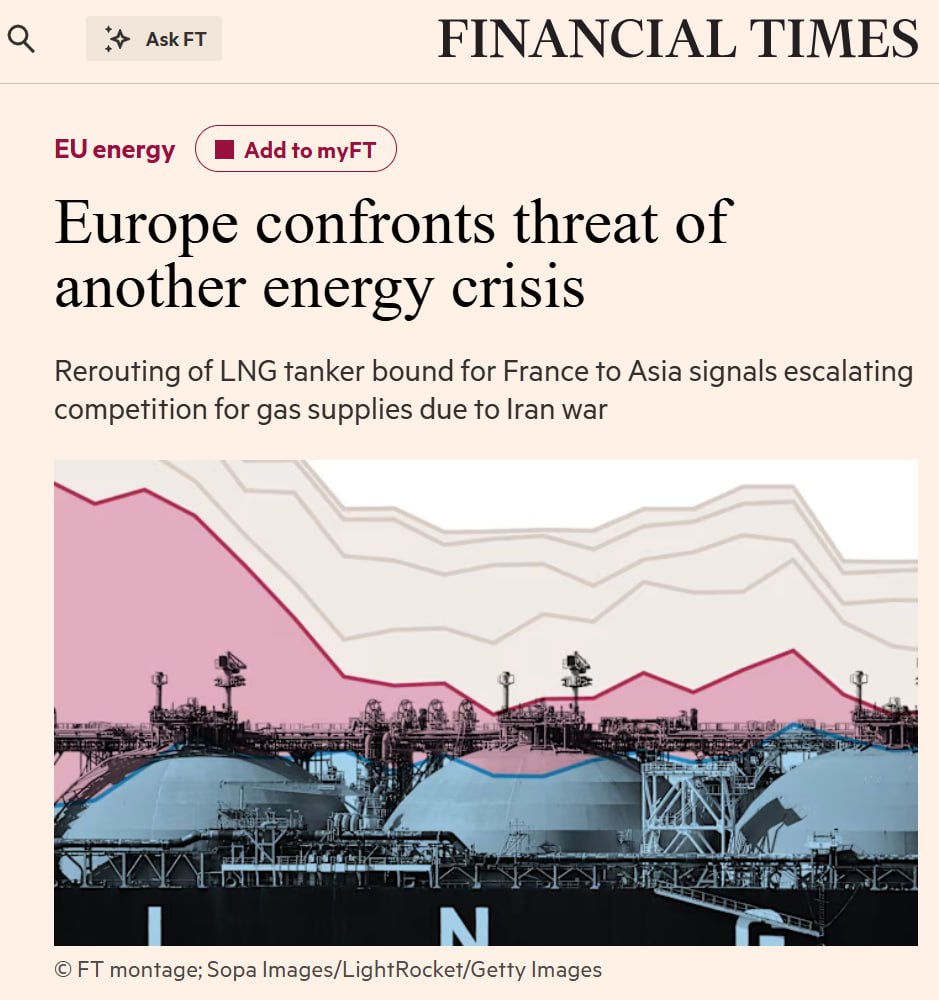 Financial Times: Европе грозит новый энергетический кризис из-за ударов по Ирану