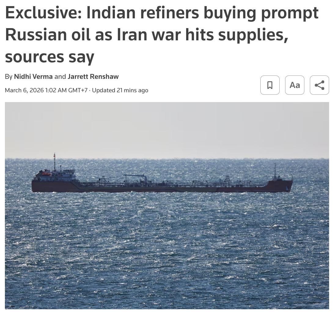 ТРЕЙДЕРЫ НАЧАЛИ ПРОДАВАТЬ РОССИЙСКУЮ НЕФТЬ URALS ДЛЯ ПОСТАВОК В ИНДИЮ С НАЦЕНКОЙ $4–$5 ЗА БАРРЕЛЬ К ЦЕНЕ BRENT — РАНЬШЕ, ДО КОНФЛИКТА ВОКРУГ ИРАНА, ОНА ПРОДАВАЛАСЬ С БОЛЬШИМ ДИСКОНТОМ — RTRS