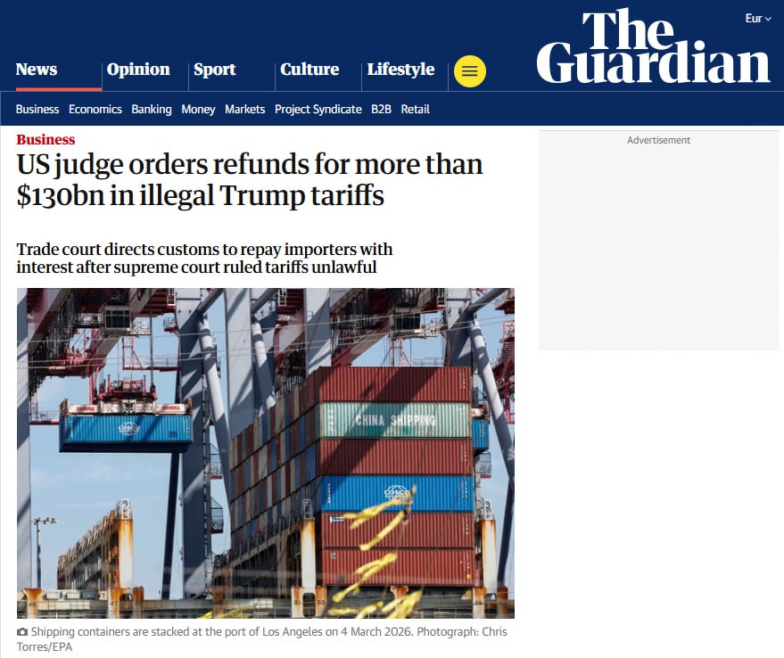 Федеральный суд США обязал правительство начать выплачивать компенсации за уплату незаконно введённых пошлин, сообщает The Guardian. Ведомство должно вернуть импортёрам всю сумму переплаты с процентами, речь идёт о $130 миллиардах.