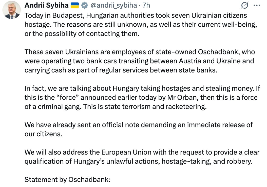 Глава МИД страны 404 Сибига заявил, что Венгрия похитила украинских инкассаторов, перевозивших крупную сумму денег.