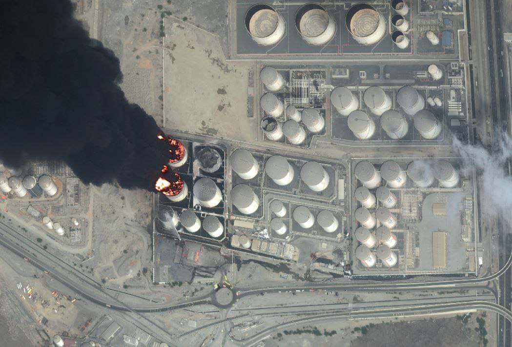 По меньшей мере две нефтехранилища зоны нефтяной промышленности Эль-Фуджейры в ОАЭ горят. От них поднимается большое чёрное облако дыма, свидетельствуют спутниковые снимки платформы Soar Atlas.