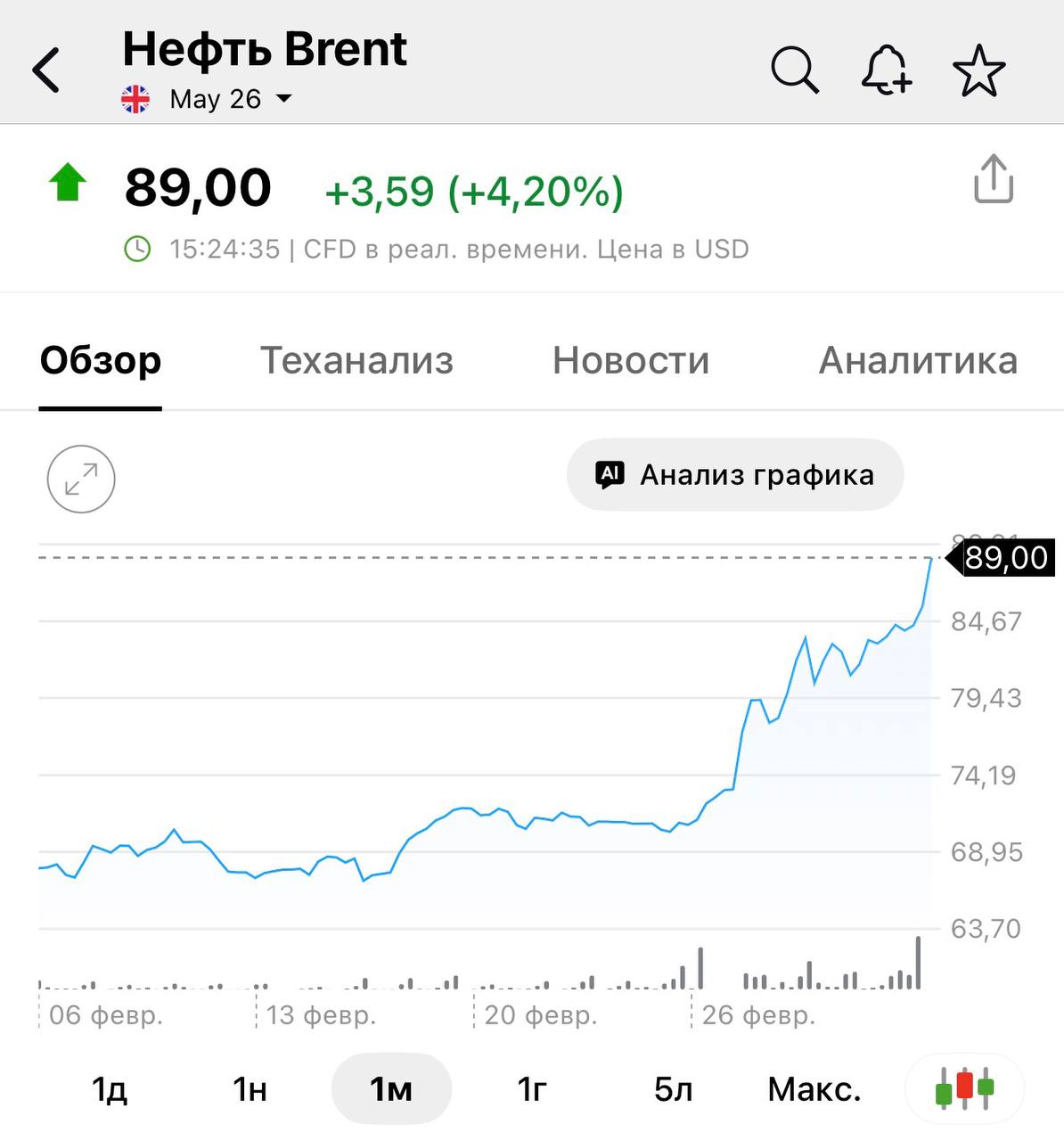 Нефть марки Brent пробила отметку в 89 долларов за баррель