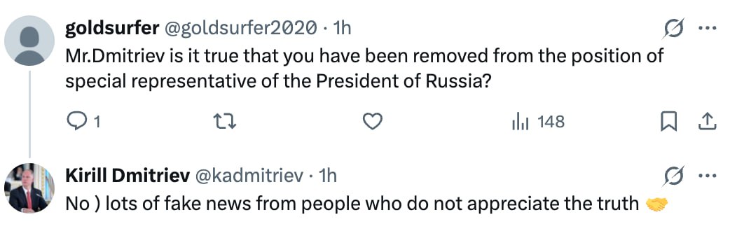 Кирилл Дмитриев опроверг информацию о том, что его якобы сняли с должности спецпредставителя президента России по инвестиционно-экономическому сотрудничеству с зарубежными странами.