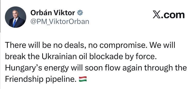 Никаких сделок, никаких компромиссов. Мы силой прорвем украинскую нефтяную блокаду. Венгерская энергия скоро снова будет поступать по трубопроводу «Дружба».