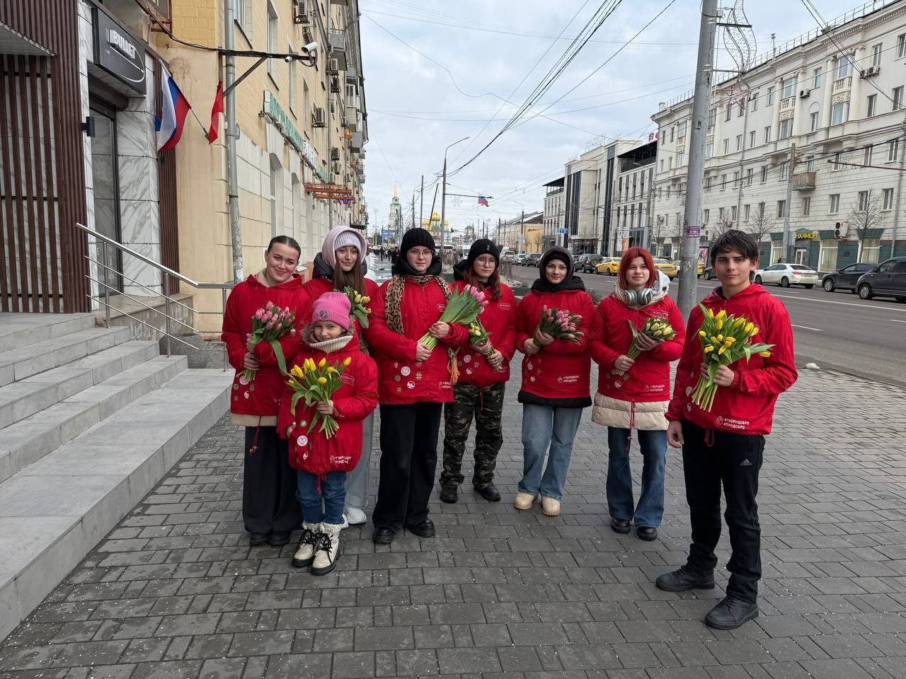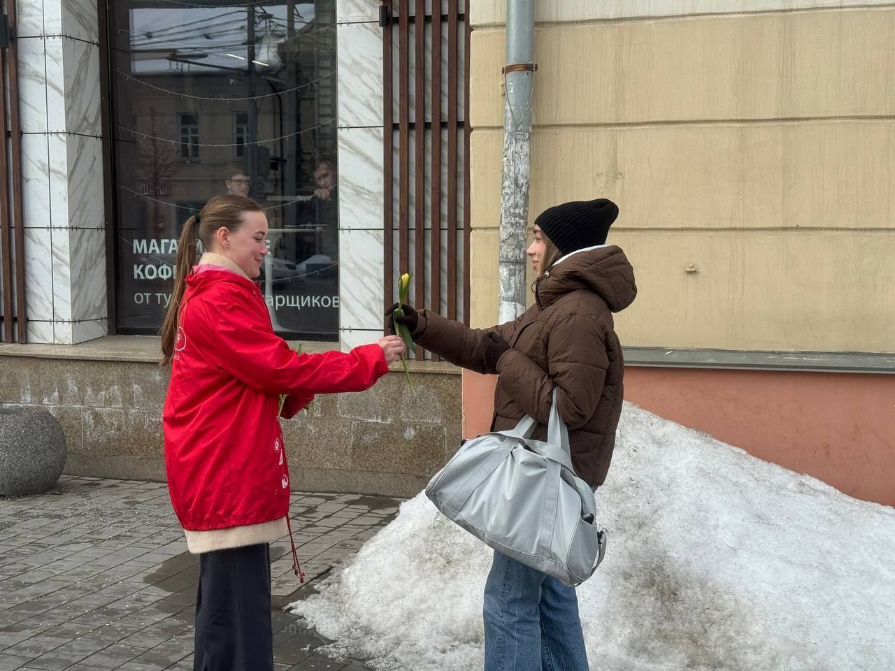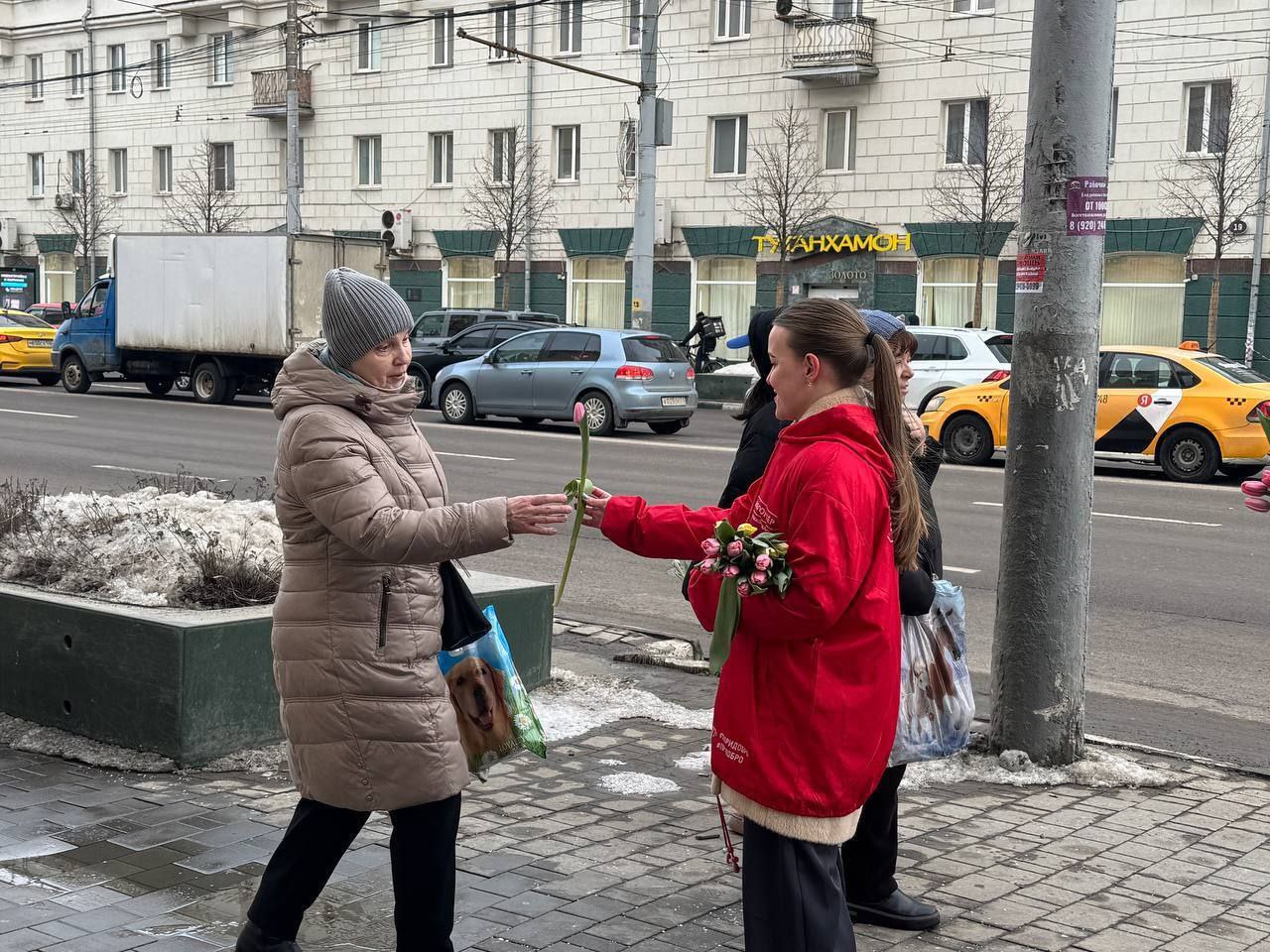 Прямо сейчас: в Туле волонтеры поздравляют женщин с 8 марта. Так проходит Всероссийская акция к Международному женскому дню