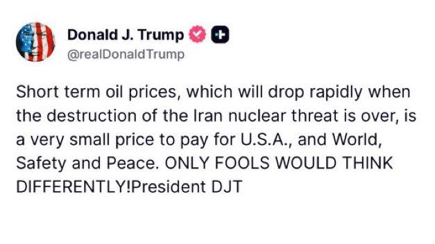 "Краткосрочные цены на нефть, которые быстро упадут, когда устранение иранской ядерной угрозы закончится, — это очень небольшая цена, которую придется заплатить за безопасность и мир в США и во всем мире. ТОЛЬКО ДУРАКИ БУДУТ ДУМАТЬ ИНАЧЕ!"
