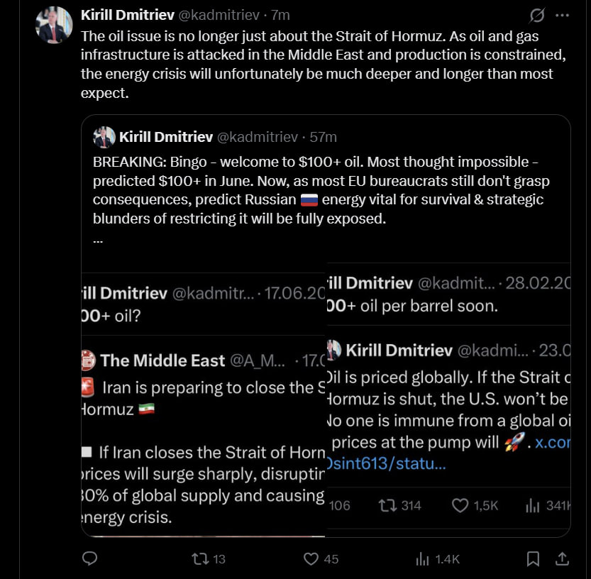 «Бинго - добро пожаловать в нефть по $100+. Большинство считали это невозможным - а я прогнозировал $100+ в июне. Теперь, когда большинство бюрократов ЕС всё еще не осознают последствий, мой прогноз о том, что российская энергия жизненно важна для выживания и что стратегические ошибки по ее ограничению будут полностью разоблачены, сбывается».