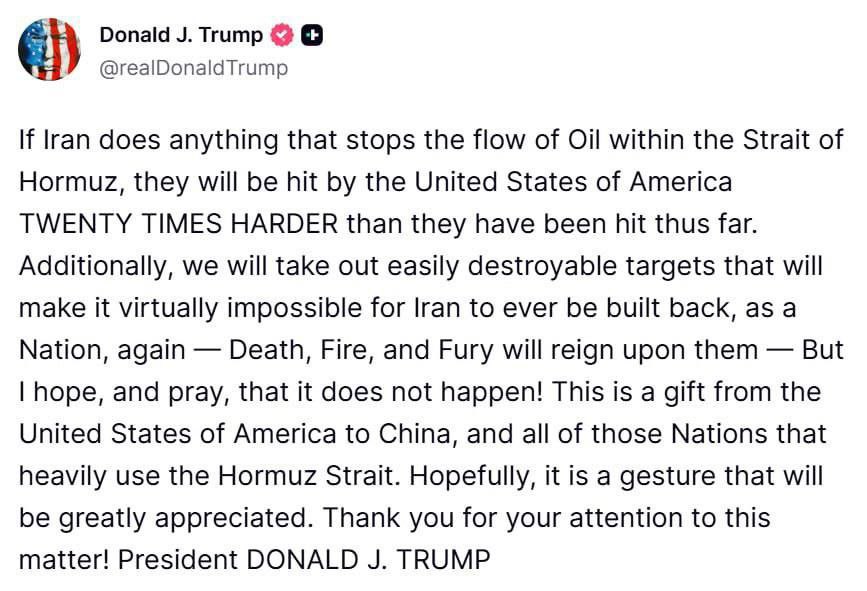 Если Иран предпримет что-либо, что остановит поток нефти в Ормузском проливе, Соединенные Штаты Америки нанесут ему удар в двадцать РАЗ сильнее, чем до сих пор. Кроме того, мы уничтожим легко разрушаемые цели, что сделает практически невозможным восстановление Ирана как нации — Смерть, Огонь и Ярость воцарятся над ними — Но я надеюсь и молюсь, чтобы этого не произошло! Это подарок от Соединенных Штатов Америки Китаю и всем тем странам, которые активно используют Ормузский пролив. Надеюсь, этот жест будет высоко оценен. Спасибо за ваше внимание к этому вопросу! Президент ДОНАЛЬД Дж. ТРАМП