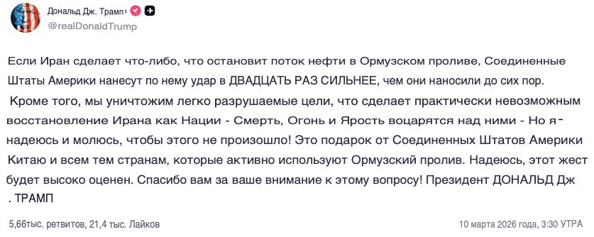 Если Иран предпримет что-либо, что остановит поток нефти в Ормузском проливе — США нанесут по нему удар в 20 раз сильнее, чем были до этого, написал Трамп в своей соцсети.
