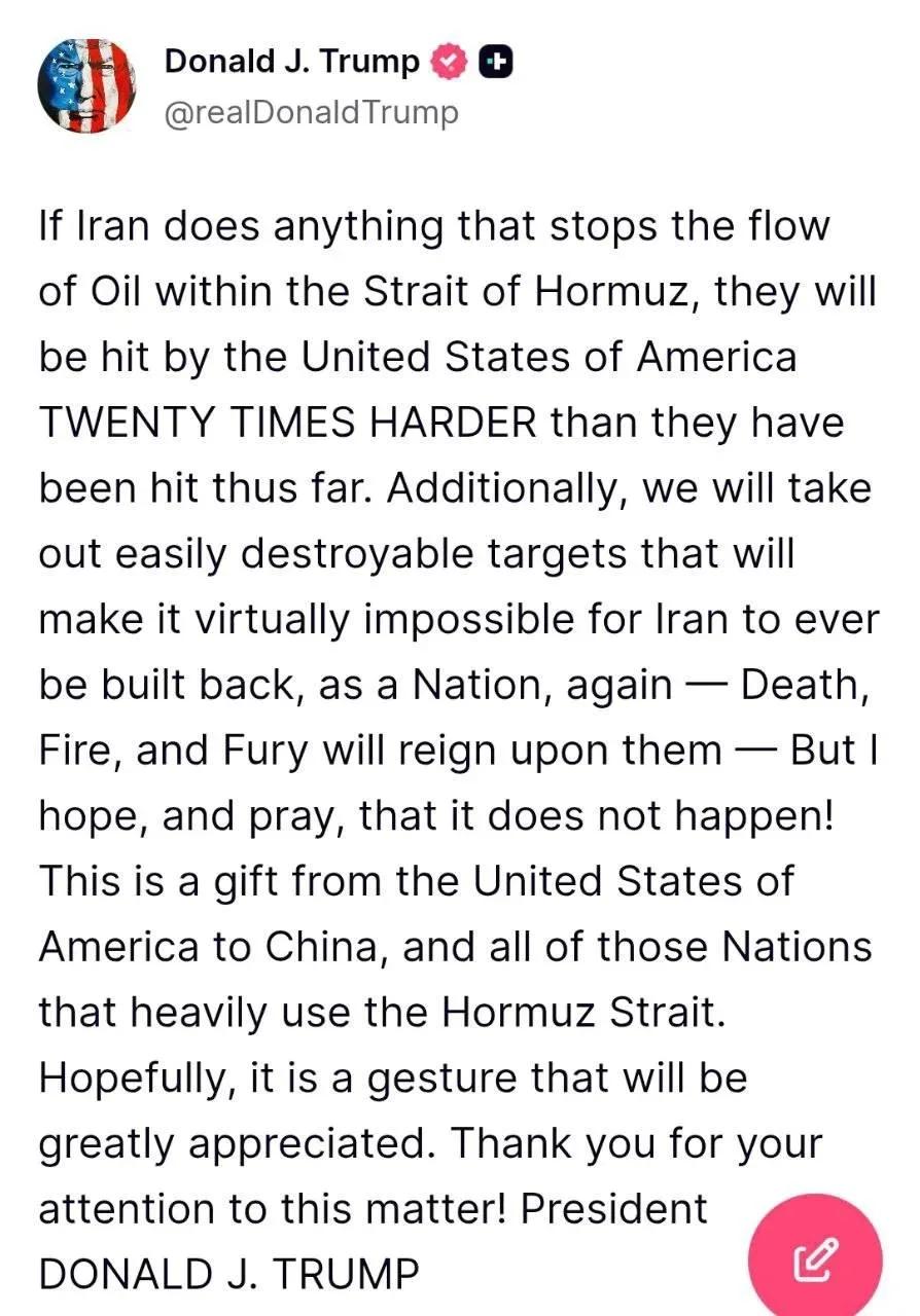"Если Иран сделает что-либо, что остановит поток нефти через Ормузский пролив, США нанесут по нему удар в 20 раз сильнее, чем те удары, которые уже были. Кроме того, мы уничтожим легко поражаемые цели, что сделает практически невозможным восстановление Ирана как государства...... Но я надеюсь и молюсь, чтобы до этого не дошло. Это — подарок США Китаю и всем тем странам, которые в значительной степени используют Ормузский пролив. Надеюсь, что этот жест будет высоко оценён".