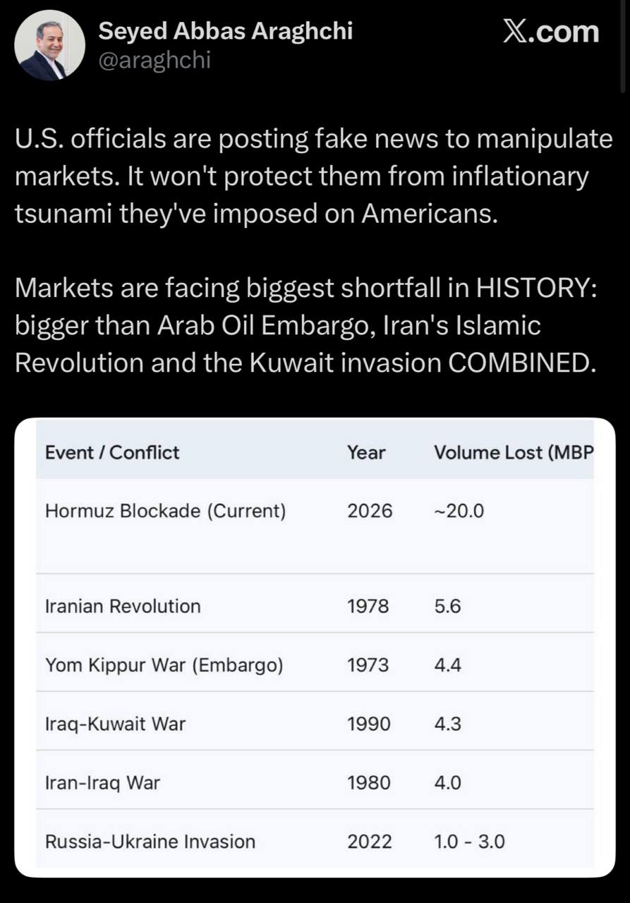«Американские официальные лица публикуют фейковые новости, чтобы манипулировать рынками. Это не защитит их от инфляционного цунами, которое они обрушили на американцев» – министр иностранных дел Ирана Аббас Арагчи.