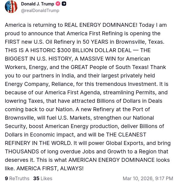Америка возвращает себе НАСТОЯЩЕЕ ЭНЕРГЕТИЧЕСКОЕ ДОМИНИРОВАНИЕ! Сегодня я с гордостью объявляю, что компания America First Refining открывает ПЕРВЫЙ новый нефтеперерабатывающий завод в США за 50 ЛЕТ в Браунсвилле, Техас. ЭТО ИСТОРИЧЕСКАЯ СДЕЛКА НА $300 МИЛЛИАРДОВ ДОЛЛАРОВ — КРУПНЕЙШАЯ В ИСТОРИИ США, ОГРОМНАЯ ПОБЕДА для американских рабочих, энергетики и ВЕЛИКОЛЕПНЫХ жителей Южного Техаса! Благодарю наших партнёров из Индии и их крупнейшую частную энергетическую компанию Reliance за эти колоссальные инвестиции. Именно благодаря нашей программе «Америка прежде всего», упрощению разрешительных процедур и снижению налогов в нашу страну вернулись сделки на миллиарды долларов. Новый нефтеперерабатывающий завод в порту Браунсвилла будет снабжать рынки США, укреплять нашу национальную безопасность, стимулировать американское энергопроизводство, приносить миллиарды долларов экономического эффекта и станет САМЫМ ЧИСТЫМ НЕФТЕПЕРЕРАБАТЫВАЮЩИМ ЗАВОДОМ В МИРЕ. Он будет обеспечивать глобальный экспорт и принесёт ТЫСЯЧИ давно назревших рабочих мест и роста в регион, который этого заслуживает. Вот как выглядит АМЕРИКАНСКОЕ ЭНЕРГЕТИЧЕСКОЕ ДОМИНИРОВАНИЕ. АМЕРИКА ПРЕЖДЕ ВСЕГО, ВСЕГДА!