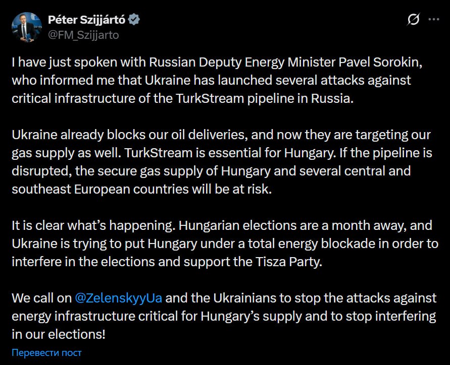 Мы призываем Зеленского и украинцев прекратить нападения на энергетическую инфраструктуру, имеющую решающее значение для поставок в Венгрию, и прекратить вмешательство в наши выборы!»