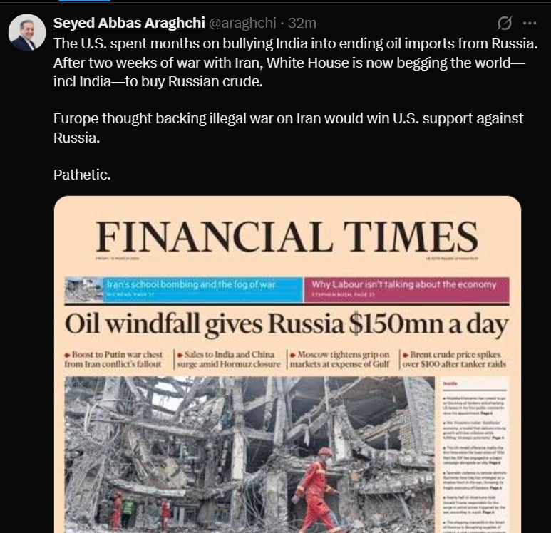«США месяцами давили на Индию, заставляя её прекратить импорт нефти из России. Спустя две недели войны с Ираном Белый дом теперь умоляет весь мир — включая Индию — покупать российскую сырую нефть.