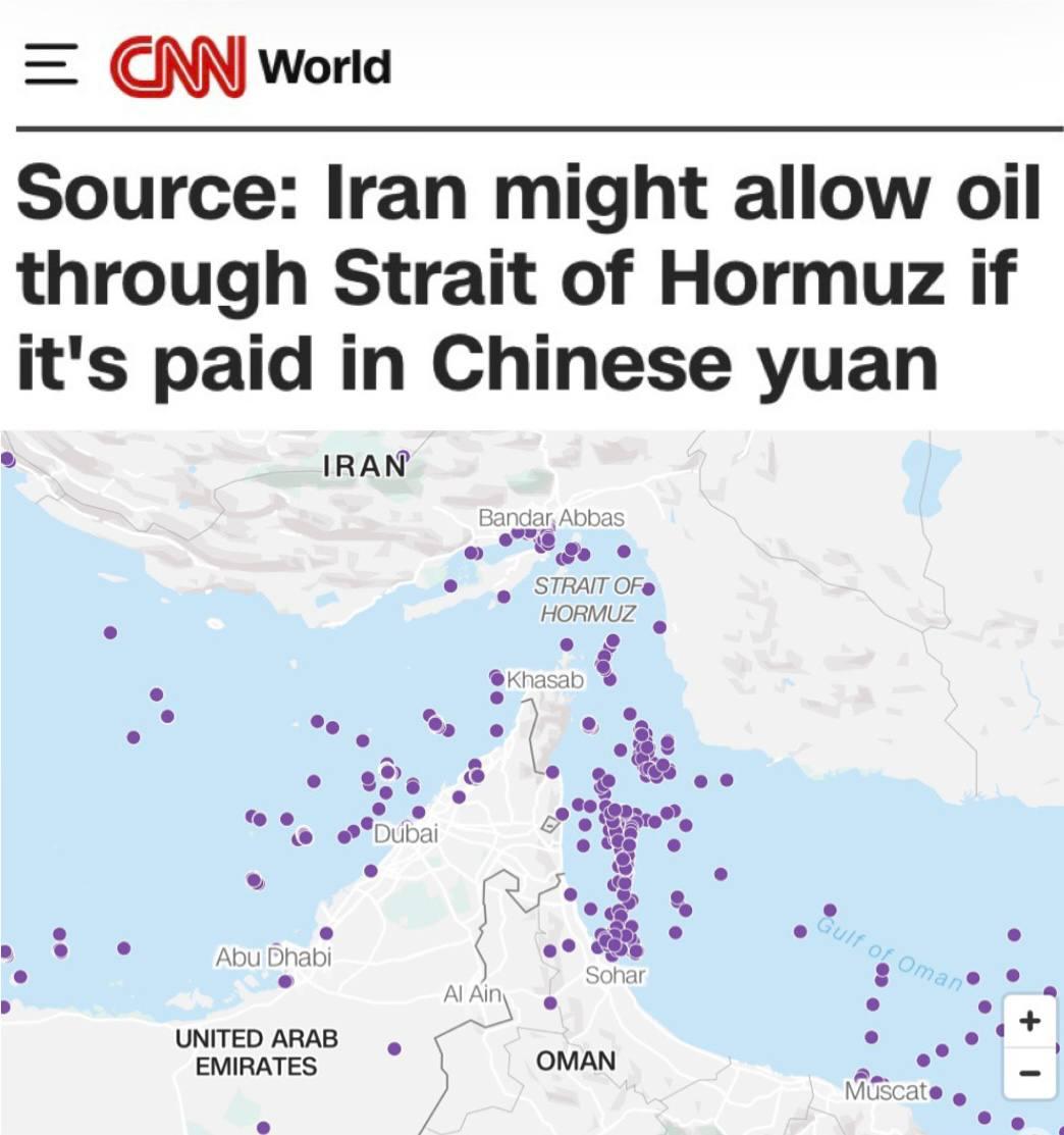 «Иран рассматривает возможность частично открыть Ормузский пролив для прохода нефтяных танкеров, но при одном условии — если сделки по продаже нефти будут проводиться в китайских юанях. По данным источников, власти страны обсуждают новый механизм регулирования движения судов через пролив».