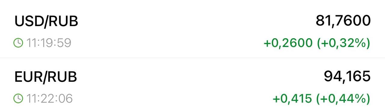 Евро — выше 94 рублей, доллар — 81 рубль на бирже.