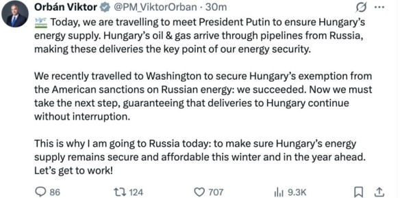 «Сегодня мы отправляемся на встречу с президентом Путиным, чтобы обеспечить энергетическую безопасность Венгрии. Нефть и газ в Венгрию поступают по трубопроводам из России, и эти поставки являются ключевым элементом нашей...