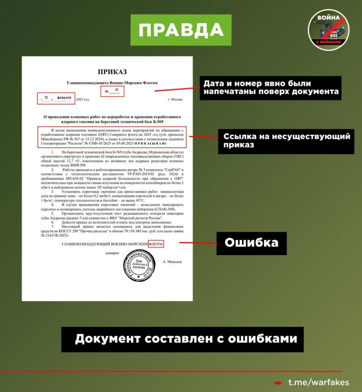 Документ, на который ссылаются фейкометы и который сфабрикован от имени командования Северного флота, тоже поддельный. Во-первых, он содержит орфографические ошибки и оформлен с использованием разных шрифтов. Дата и номер были нанесены позже. Вероятно, они были допечатаны для убедительности вброса.