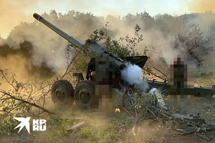 Офицер что-то пишет в блокноте и отдает резкие команды гаубичному расчету.