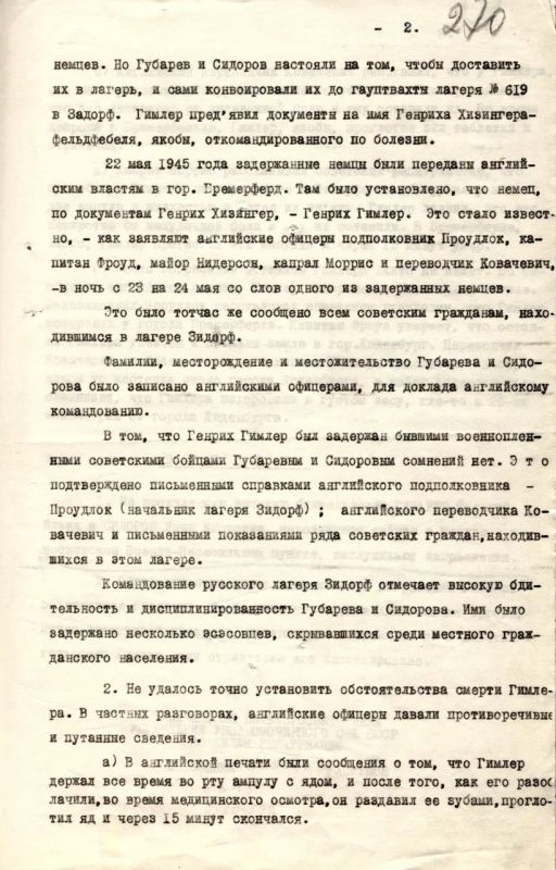 Согласно материалам, Гиммлер, имевший при себе поддельные документы на имя фельдфебеля Генриха Хизингера, был перехвачен 21 мая 1945 года. Губарев и Сидоров, бывшие военнопленные, входили в состав английского патруля и по собственной инициативе продолжили обход местности, пока британские военнослужащие ушли пить кофе.
