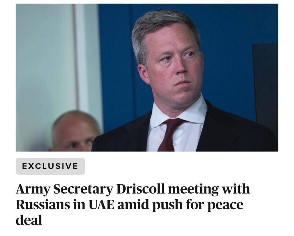 По даннымпортала, Дрисколл вчера вечером встретился с неназванными представителями российской России в Абу-Даби на несколько часов. Он планирует встретиться с ними ещё раз в течение сегодняшнего дня, чтобы обсудить мирный процесс и ускорить продвижение мирных переговоров. Москва пока эту информацию не подтверждала.