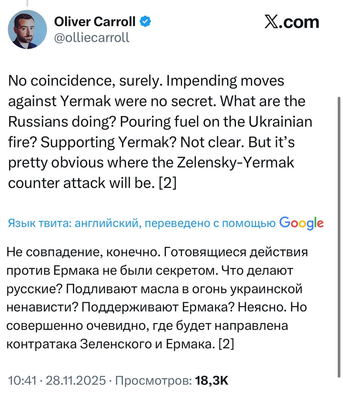 Появились новости о рейдах антикоррупционных органов на ключевого помощника Зеленского Ермака. А два дня назад в подконтрольной Кремлю прессе совершенно неожиданно был показан российский паспорт главы антикоррупционного прокурора КлименкоНе совпадение, конечно. Готовящиеся действия против Ермака не были секретом. Что делают русские? Подливают масла в огонь украинской ненависти? Поддерживают Ермака? Неясно. Но совершенно очевидно, куда будет направлена контратака Зеленского и Ермака.