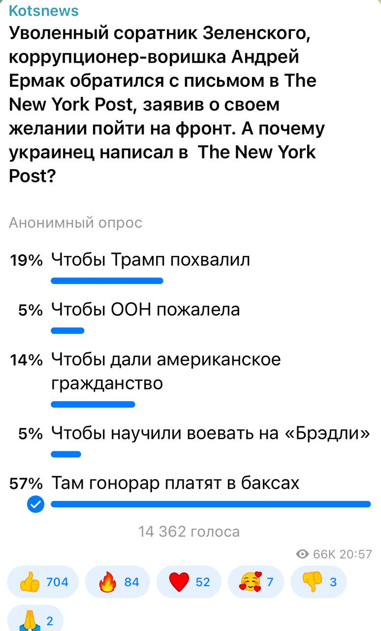 57 процентов подписчиков считают, что Ермак рассчитывает на гонорар в баксах. Надо же как-то обеспечить себе безбедную старость.