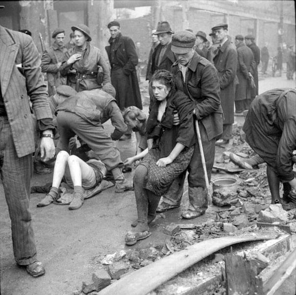 Чтобы помнили!Освобождение советских принудительно удерживаемых женщин из подвалов Оснабрюка, подожжённых немецкой полицией.Германия, 7 апреля 1945 года.