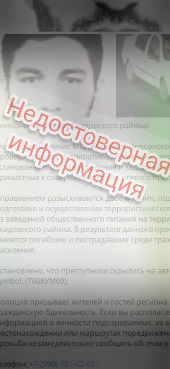 В частности, сообщается, что Главное управление МВД России по Херсонской области распространило информацию о якобы розыске двоих подозреваемых, причастных ко взрыву в кафе в поселке Хорлы Херсонской области, скрывшихся на легковом автомобиле.