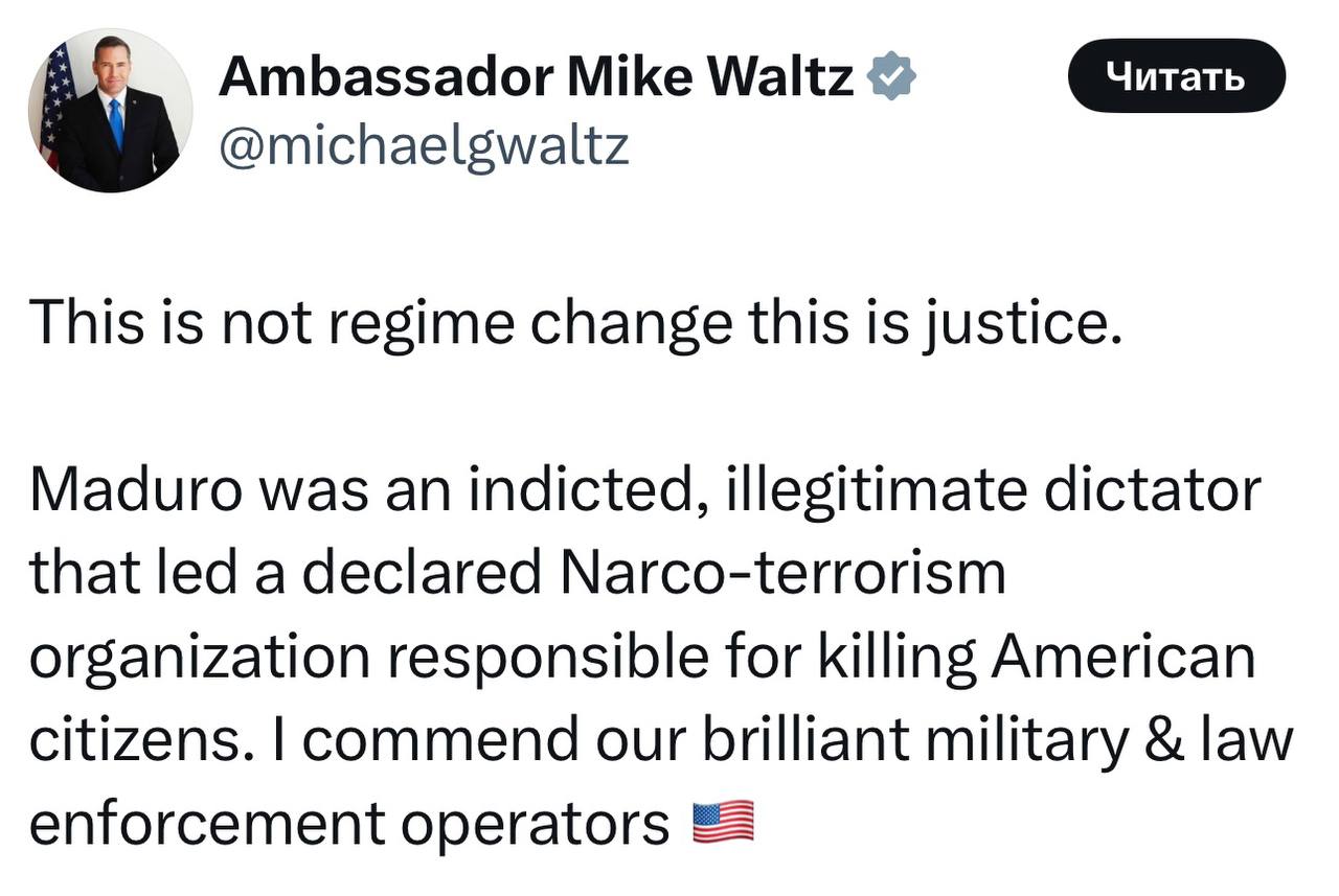 Мадуро был обвиненным, нелегитимным диктатором, возглавлявшим объявленную наркотеррористическую организацию, ответственную за убийство американских граждан. Я высоко оцениваю работу наших блестящих военных и сотрудников правоохранительных органов.
