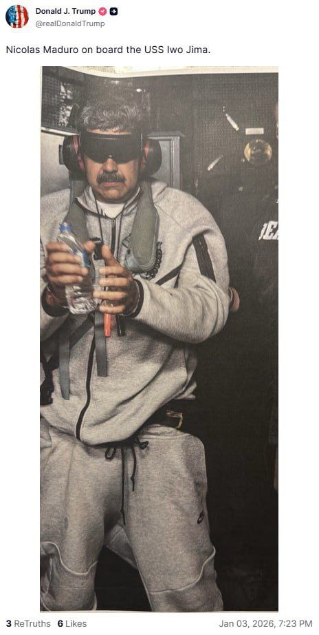 Трамп показал фото захваченного Мадуро и заявил, что США берут на себя управление Венесуэлой на переходный период, не уточнив его продолжительность.