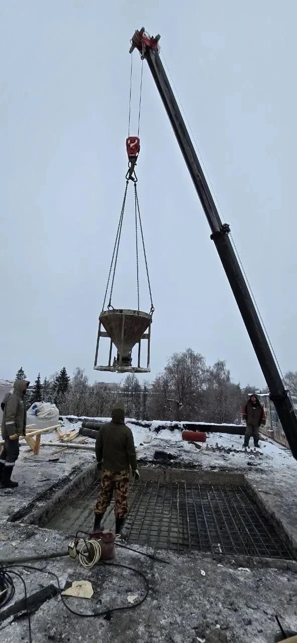 Сегодня рабочие демонтировали поврежденные части перекрытия, произвели обвязку арматуры и заливку бетона. После этого приступят к ремонтным работам внутри квартиры.