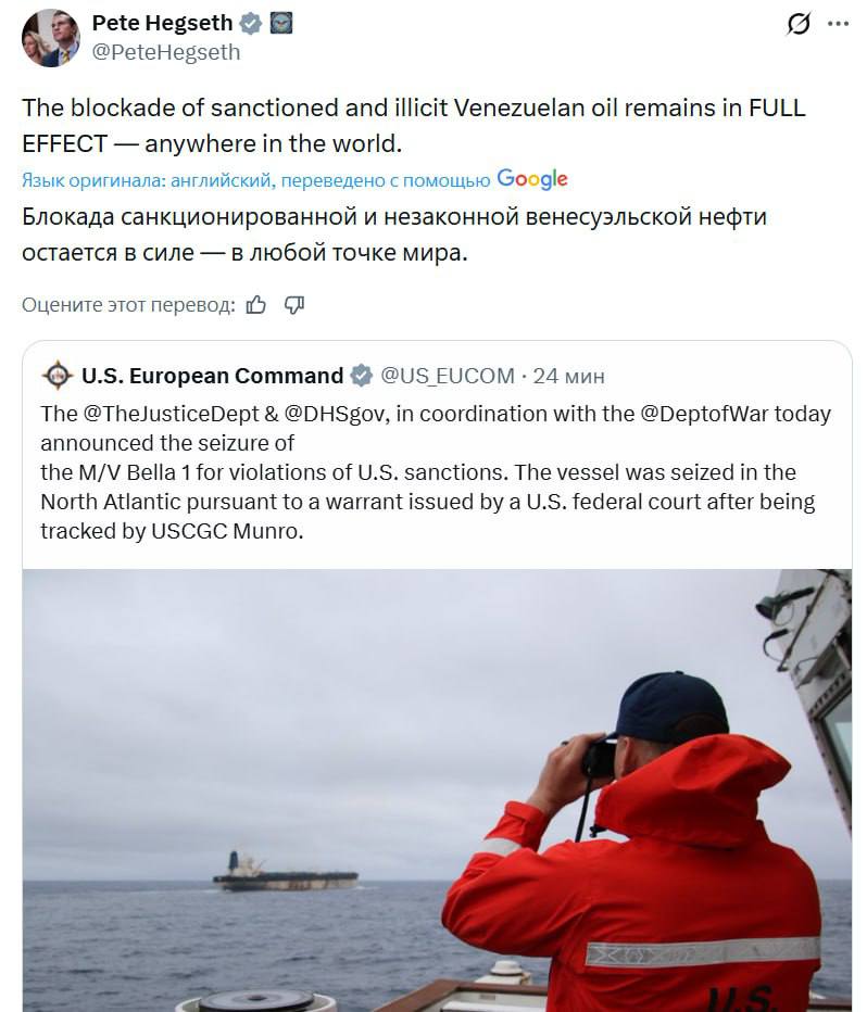 США арестовали российский танкер за нарушение американских санкций, заявило Европейское командование ВС США