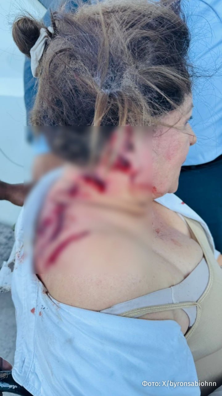 На кадрах, которые публикуют местные СМИ, видно, как в женщину бросили взрывное устройство, которое сдетонировало и повредило её плечо, шею и ухо.