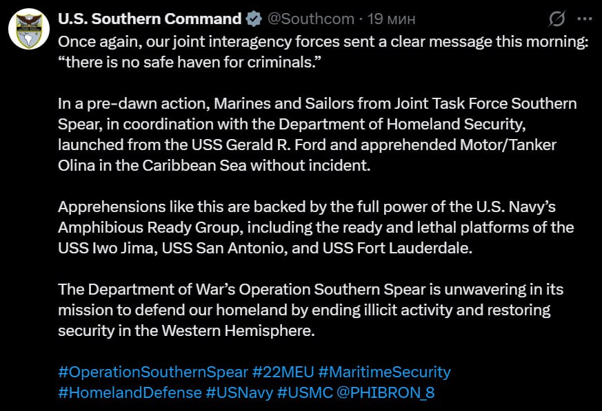 «В ходе операции, проведенной на рассвете, морские пехотинцы и моряки из Объединенной оперативной группы "Южное копье" в координации с Министерством внутренней безопасности США вышли с борта авианосца USS Gerald R. Ford и без происшествий задержали в Карибском море моторно-танкерное судно "Olina"».