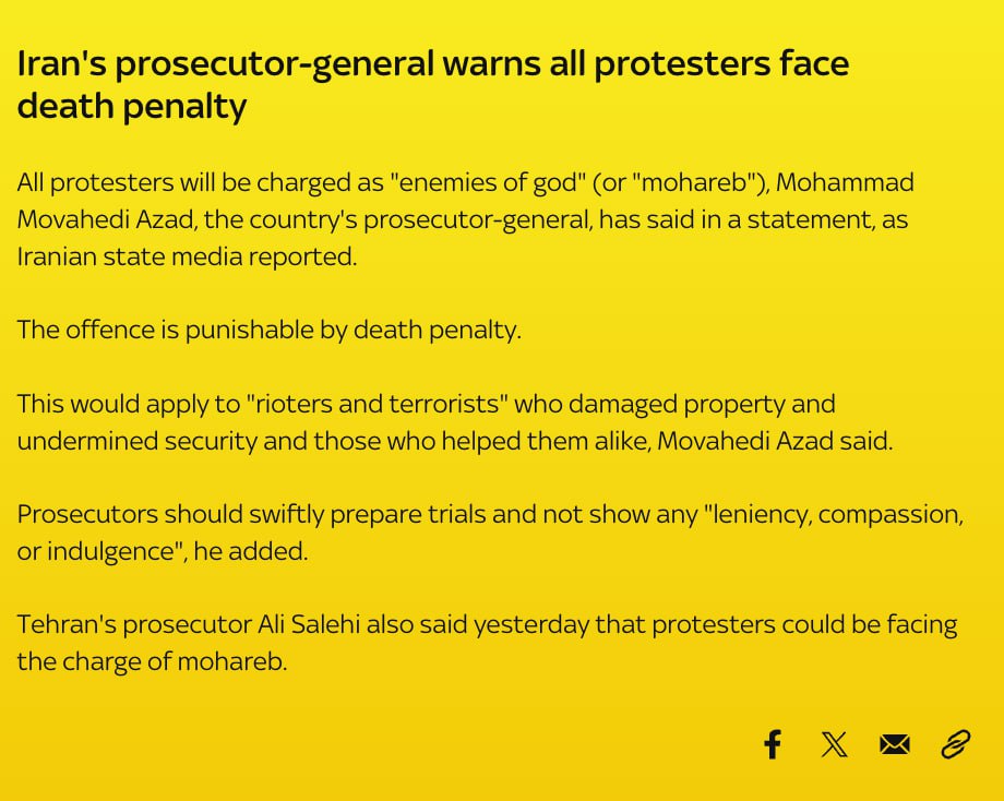 «Все участники протестов будут обвинены как „мохареб“ [ведущие войну против Бога], заявил генеральный прокурор страны Мохаммад Мовахеди Азад, о чём сообщили иранские государственные СМИ.