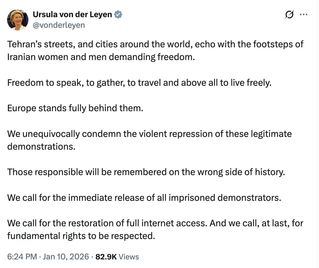 Урсула фон дер Ляйен призвала Иран к уважению фундаментальных прав — тому, чего всё чаще не хватает в самом ЕС