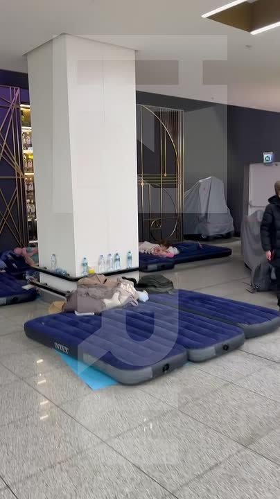 Один из застрявших в аэропорту пассажиров рассказал "Известиям", что людям приходится спать на надувных матрасах. Сергей отметил, что некоторым не хватило и их — люди лежат на тонких ковриках толщиной около двух миллиметров.