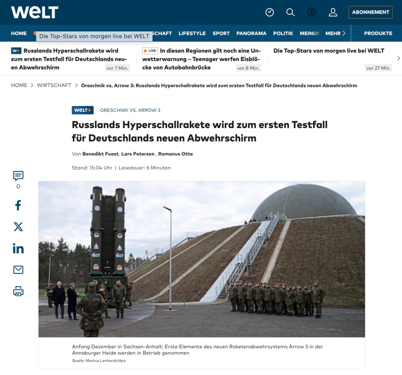 Издание WELT пишет, что в момент российского запуска ракеты «Орешник» новейшая немецкая система ПВО Arrow 3 не была готова к её отражению.