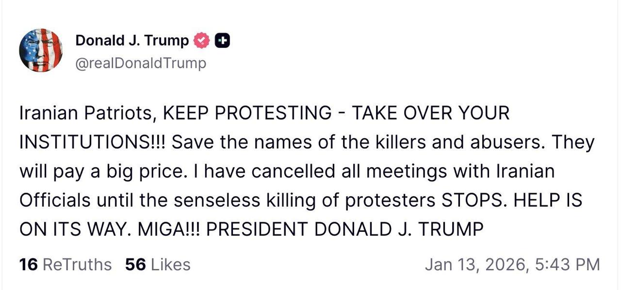 Я отменил все встречи с иранскими официальными лицами до тех пор, пока бессмысленные убийства протестующих не прекратятся. Помощь уже в пути.
