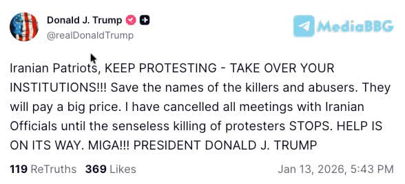[Donald J. Trump] Иранские патриоты, ПРОДОЛЖАЙТЕ ПРОТЕСТОВАТЬ - ЗАХВАТИТЕ СВОИ УЧРЕЖДЕНИЯ!!!