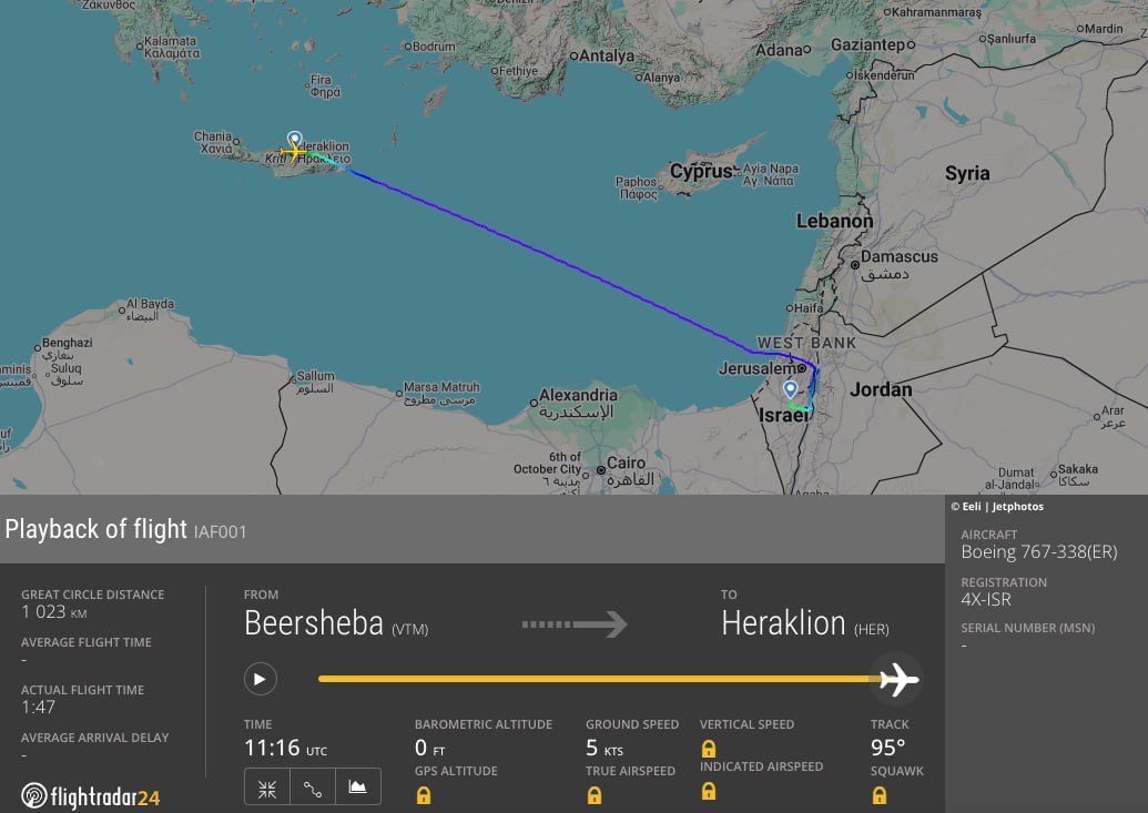 Израильский борт №1 "Крыло Сиона" — главный правительственный борт страны — переброшен на остров Крит на фоне возможной военной эскалации с Ираном. Это следует из данных сервиса отслеживания полетов.