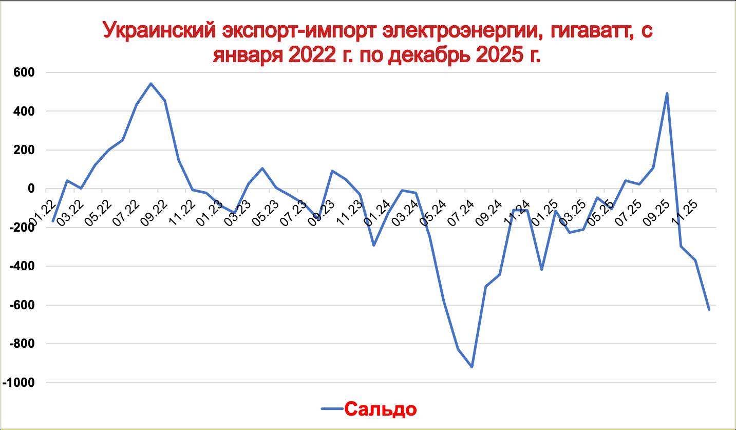 Вместе с тем температура на Украине понижается ночью до –24°, чего не наблюдалось ни за одну зиму СВО. Ко всем украинским фронтам и направлениям в сводках можно добавить ещё один фронт – атмосферный. По континенту прошагал к Украине Генерал Мороз. Давно его ждали. Как ждали и регулярных ударов по энергосистеме, которые начались в октябре 2025 и продолжаются до сих пор. Как промежуточный результат – Украина, восстановившая генерацию и ставшая экспортёром к лету 2025, снова стала импортёром. В декабре минувшего года она уже вынуждена импортировать 625 ГВт. Уже на середину января импорт составил 426 ГВт, и объём импорта неуклонно движется к своему историческому минимуму, который составлял в августе 2024 года 922 ГВт – там сопровождал удары по украинской энергосистеме полковник Жара.