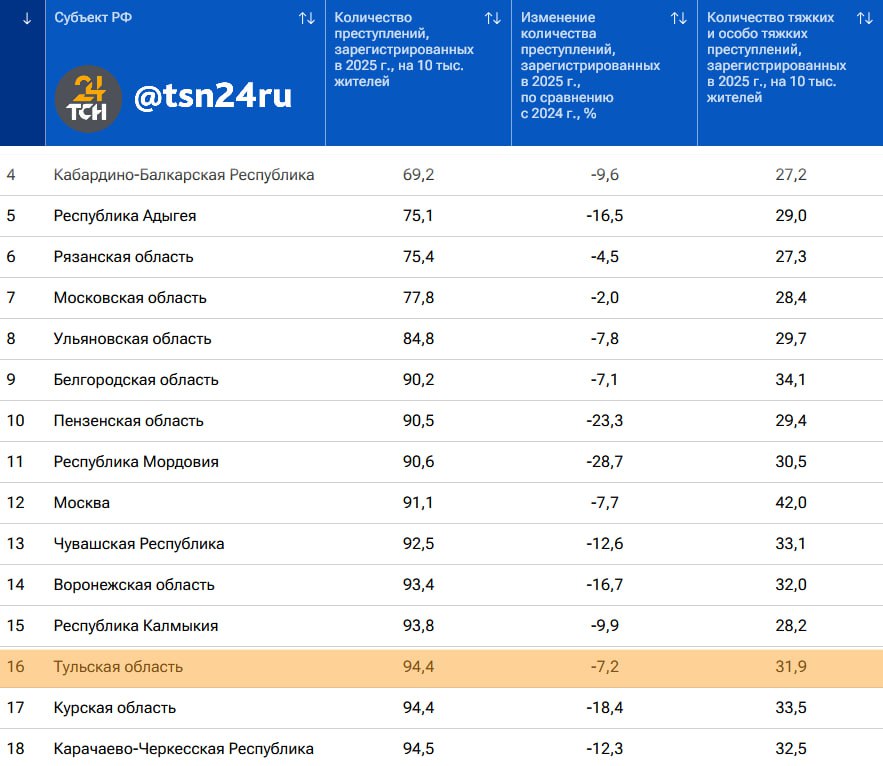 Количество преступлений на 10 тысяч жителей в 2025 году в регионе составило 94,4. Показатель на 7,2% ниже, чем годом ранее. Тяжких и особо тяжких преступлений на 10 тысяч жителей пришлось 31,9 – на 3,4% меньше, чем в 2024 году.