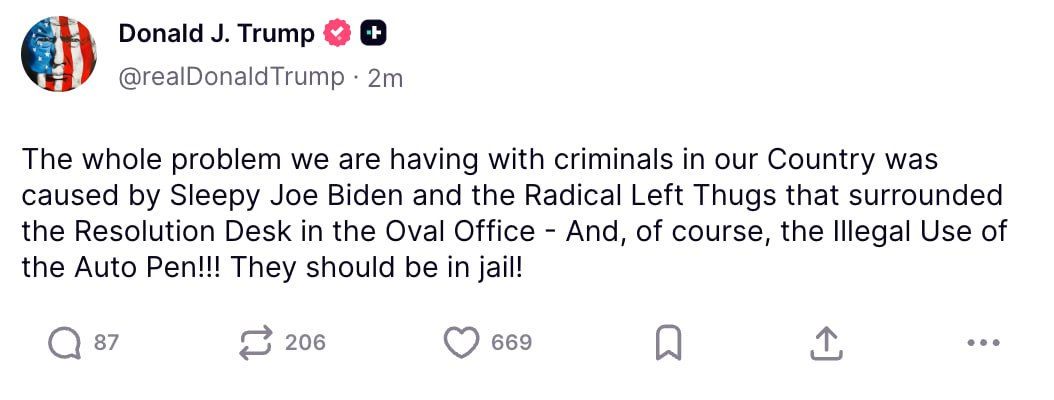 «Вся проблема с преступниками в нашей стране вызвана сонным Джо Байденом и радикальными левыми головорезами, которые окружили стол с резолюциями в Овальном кабинете, — и, конечно же, незаконным использованием авторучки!!! Они должны сидеть в тюрьме!»