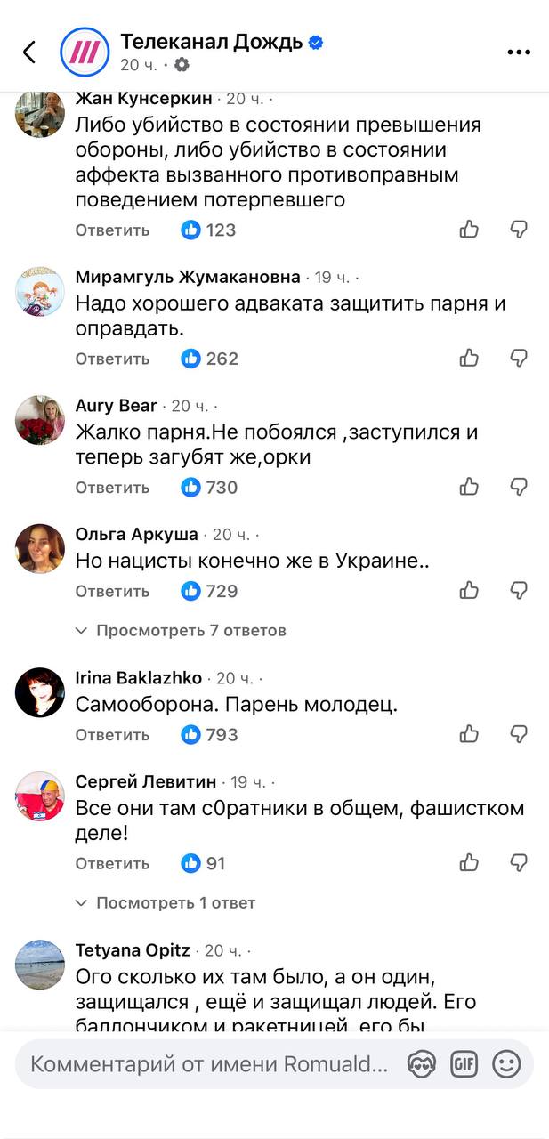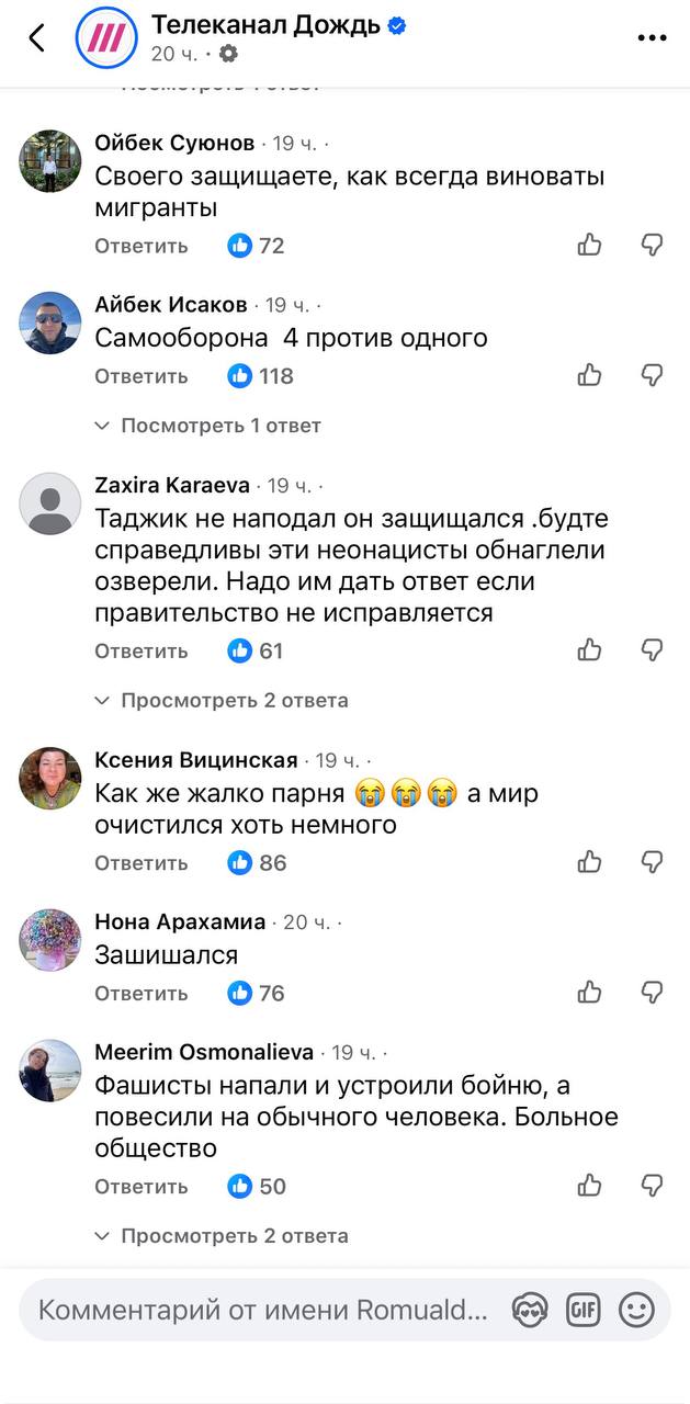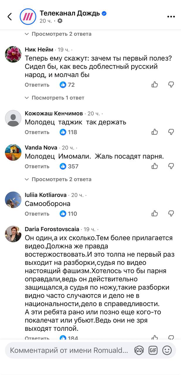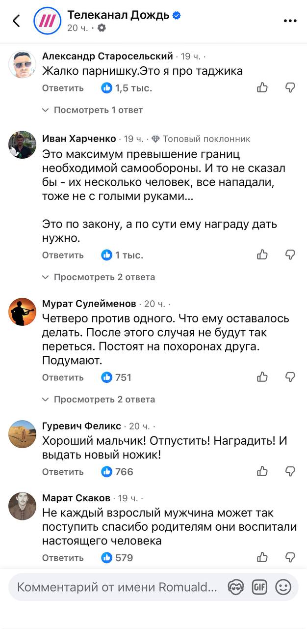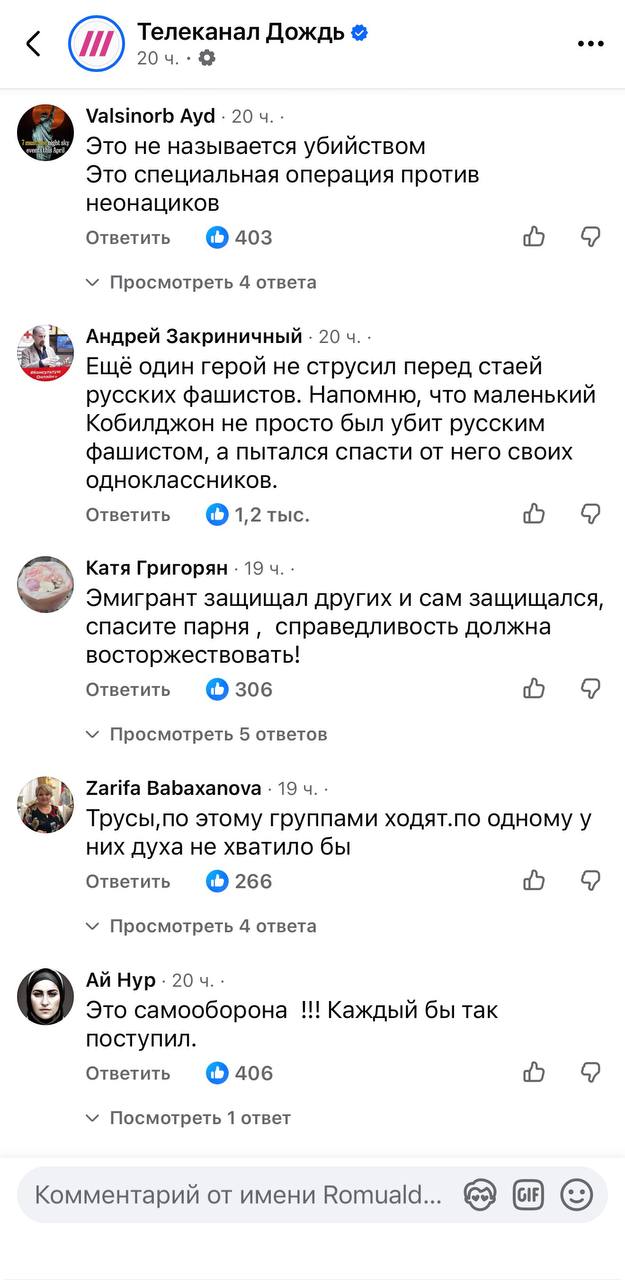 В комментариях к новости о зверском убийстве русского парня таджикским исламистом на странице иноагентского канала «Дождь» разверзся ад !